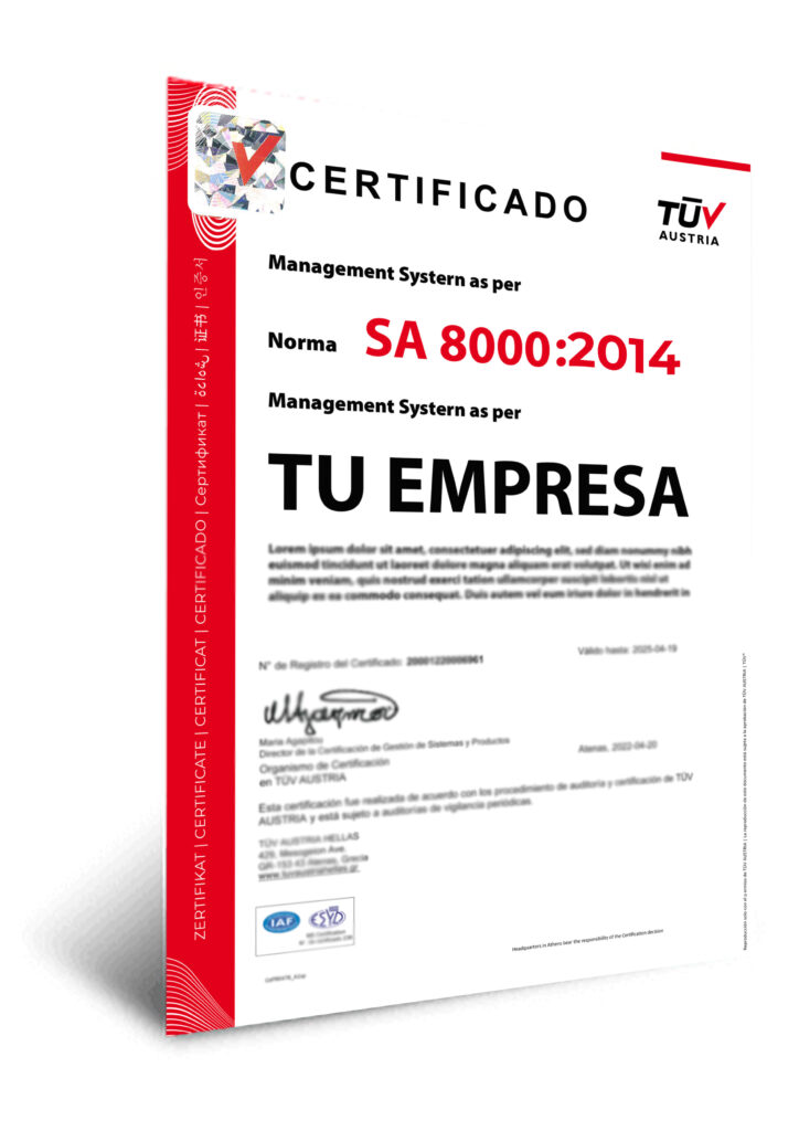 El estándar SA8000:2014® es una norma internacionalmente reconocida para la certificación social, desarrollada por Social Accountability International (SAI). En TÜV AUSTRIA, como empresa acreditada para otorgar esta certificación en Perú, ayudamos a las organizaciones a garantizar que sus prácticas laborales cumplan con los más altos estándares sociales y de derechos humanos. SA8000 es un marco integral que permite a las empresas demostrar su compromiso con la justicia social, el bienestar de los trabajadores y el cumplimiento de regulaciones internacionales.